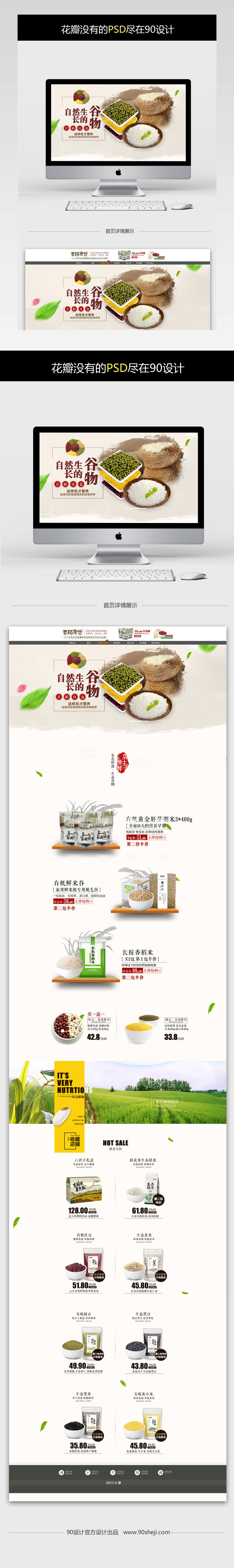 90设计提供清新简约风五谷杂粮店铺首页PSD模版设计素材下载,高清PSD格式。【通用】多类目可用,产品、模特均可替换。【PSD】精细分层,贴好片。【设计】由90设计师独家设计。点击右侧免费下载按钮可进行清新简约风五谷杂粮店铺首页PSD模版淘宝设计素材高速下载。