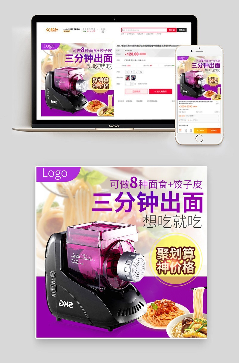 淘宝 天猫 面条背景 朦胧感 紫色背景 简约时尚 美食 面食 面条机 搅面机 搅拌机 生活电器 主图 直通车 psd模板