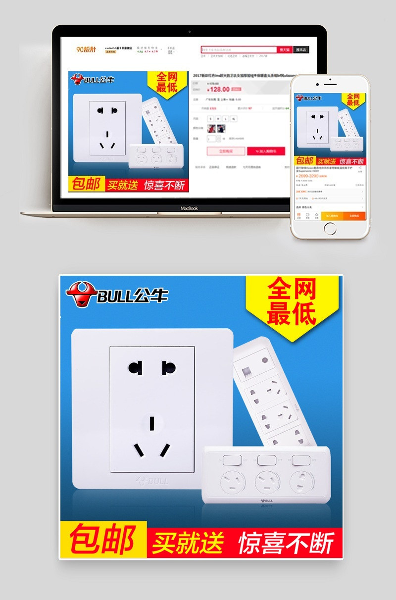 电子 电工 公牛 开关 插座 面板 暗盒 多孔接线板 主图 直通车 简约 清新风 渐变背景