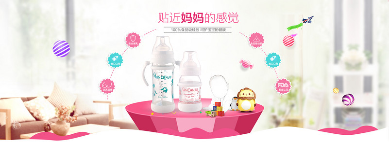 淘宝 时尚 清新 简约 母婴用品 全屏海报 奶瓶 宝宝 漂浮元素 家居背景