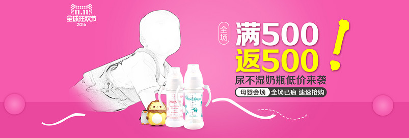 淘宝 天猫 双11 全球狂欢节 玫红色 母婴用品 全屏海报 奶瓶 尿不湿 宝宝