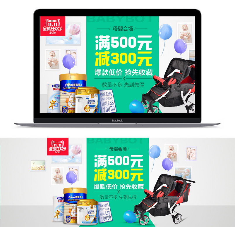 淘宝 天猫 双十一 全球狂欢节 母婴会场 全屏海报 奶粉 婴儿推车 气球