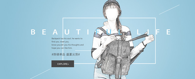 简约 简洁 首页 全屏海报 女装 箱包 小清新 文艺风 少女系列 女装首页模板 手拿包首页模板 背包首页全屏模板 手机包 双肩包 斜挎包 文艺框 线条 可爱风