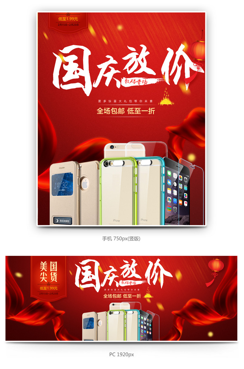 90设计提供红色国庆节手机海报 设计素材下载,高清PSD格式。【通用】多类目可用,产品、模特均可替换。【PSD】精细分层,贴好片。【设计】由90设计师独家设计。点击右侧免费下载按钮可进行红色国庆节手机海报 淘宝设计素材高速下载。