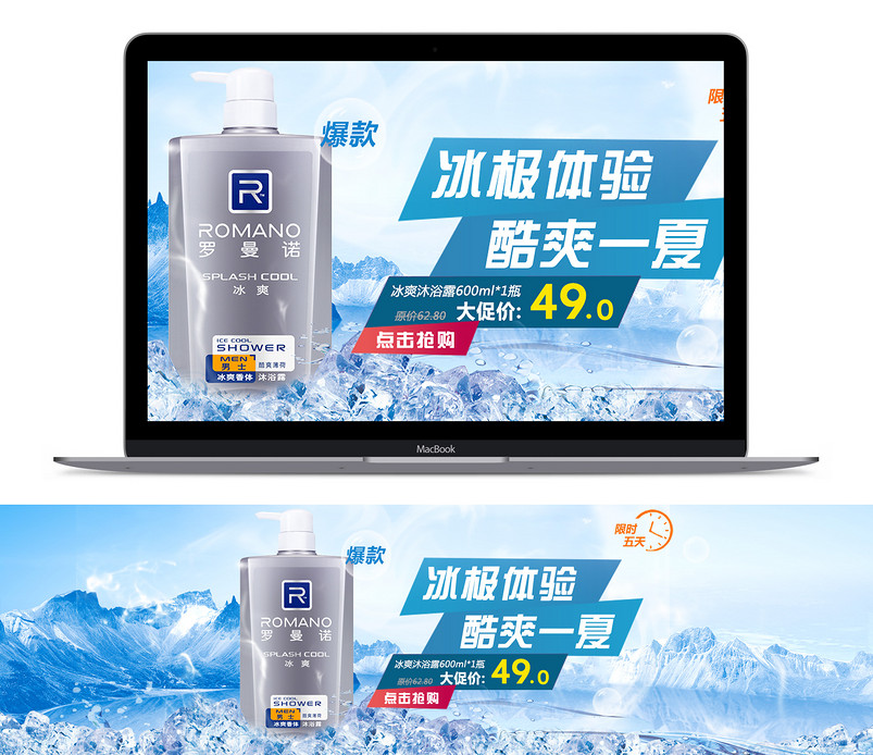 淘宝 天猫 爆款 沐浴露 限时大促 促销海报 海报素材 冰爽一夏 夏季海报 清爽海报背景