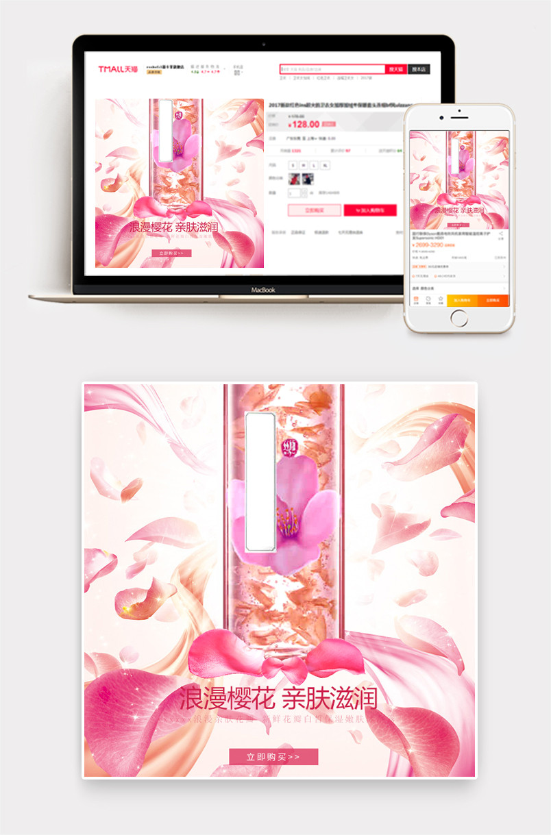 粉色背景 水花 浪漫 甜美风 洗护用品美妆直通车 花瓣 沐浴露 洗发水 护发素 主图 直通车 psd模板 分层稿