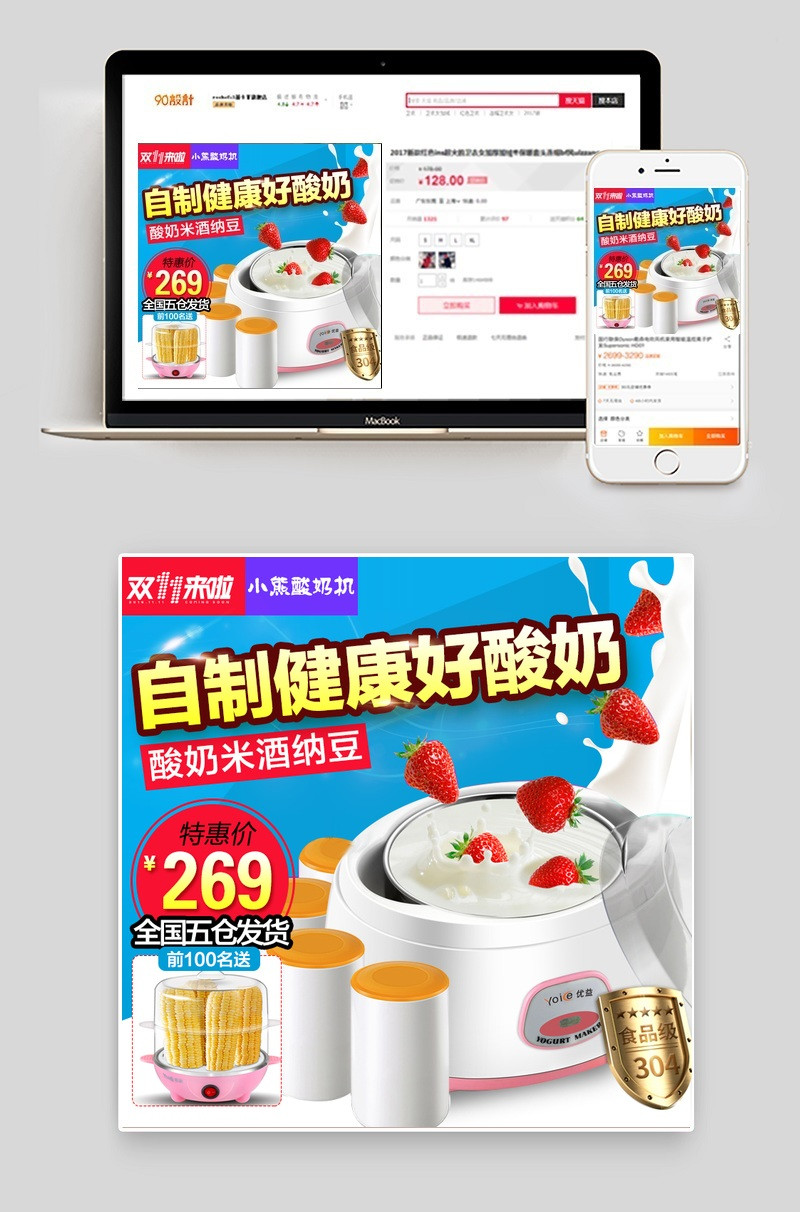 双十一蓝色简约风生活电器酸奶机纳豆机主图直通车PSD模版
