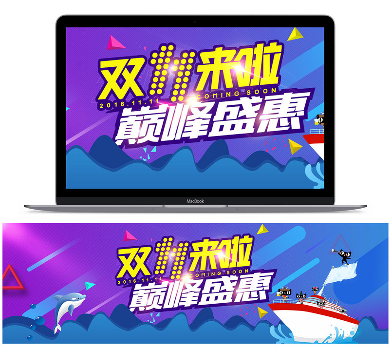 淘宝 天猫 双十一 双11 海洋 轮船 海豚 卡通 手绘 涂鸦 蓝色背景 炫彩 时尚 黄色光炫 巅峰盛宴 可爱天猫 三角 几何 线条