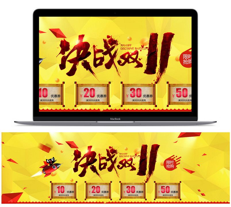 淘宝 天猫 黄色 酷炫 决战 双十一 全屏海报 优惠券 漂浮元素 火箭