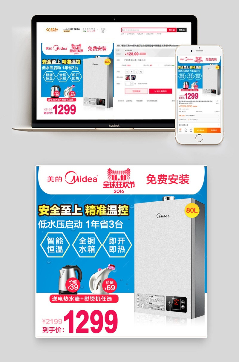 双十一蓝色简约风生活电器热水器主图直通车PSD模版