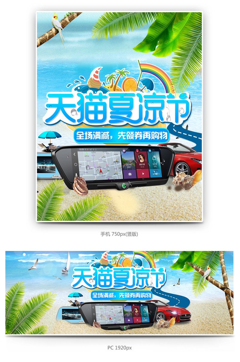 蓝色 清爽风 大海 沙滩 绿叶 汽车配件海报 车载电器 脚垫 导航 行车记录仪 全屏海报 模板 PSD
