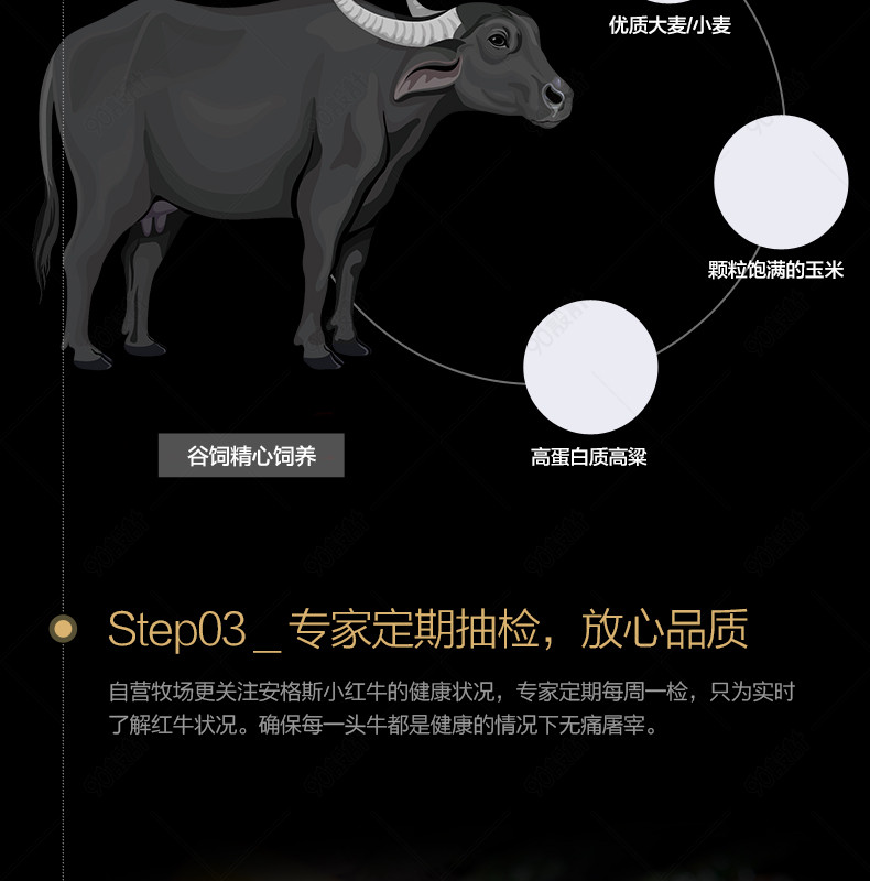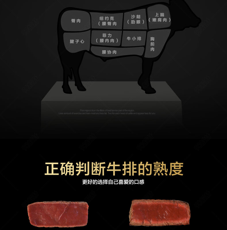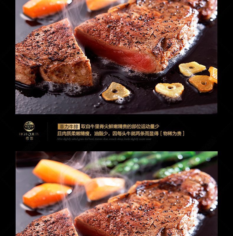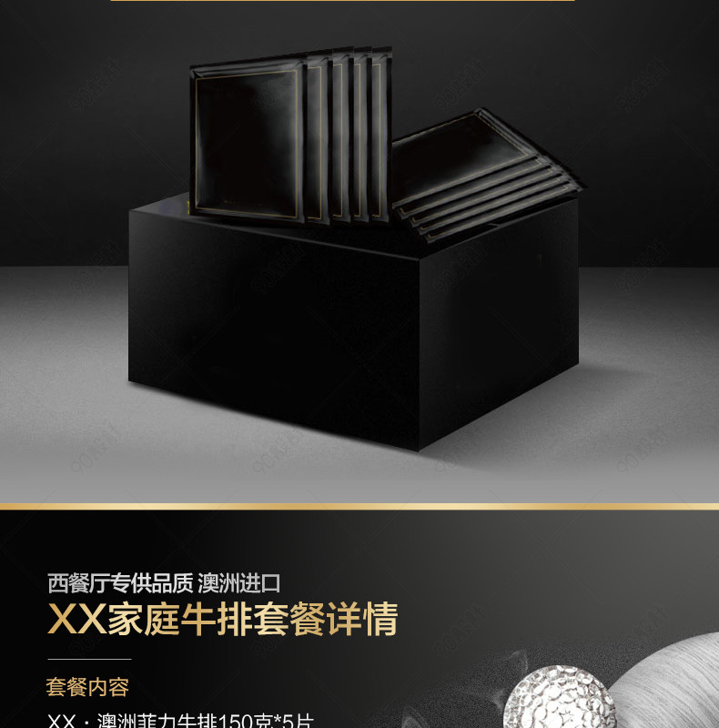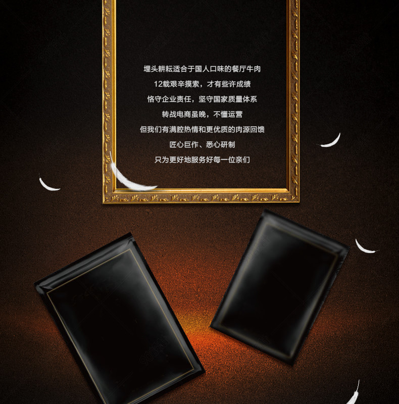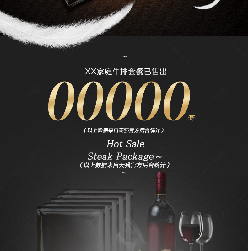 牛排详情页 猪排 牛肉 食品详情页 黑色背景 塑封包装 羽毛 相框 礼盒 餐具 红酒 牛 蔬菜