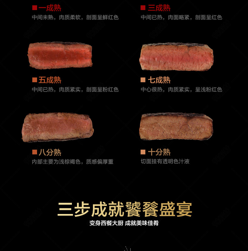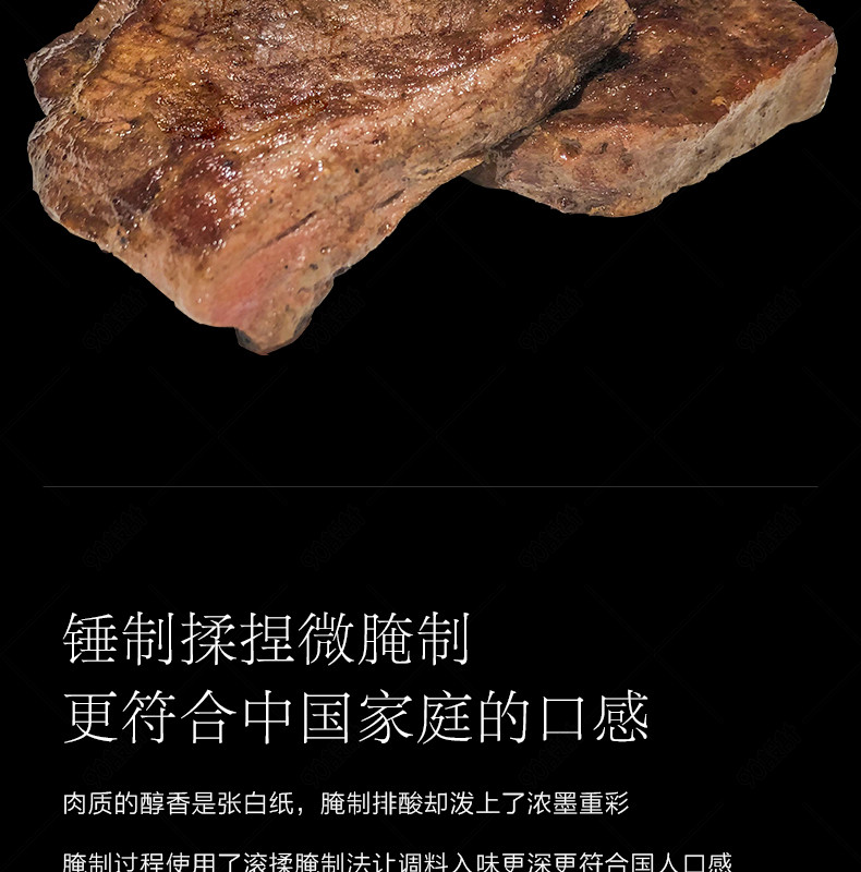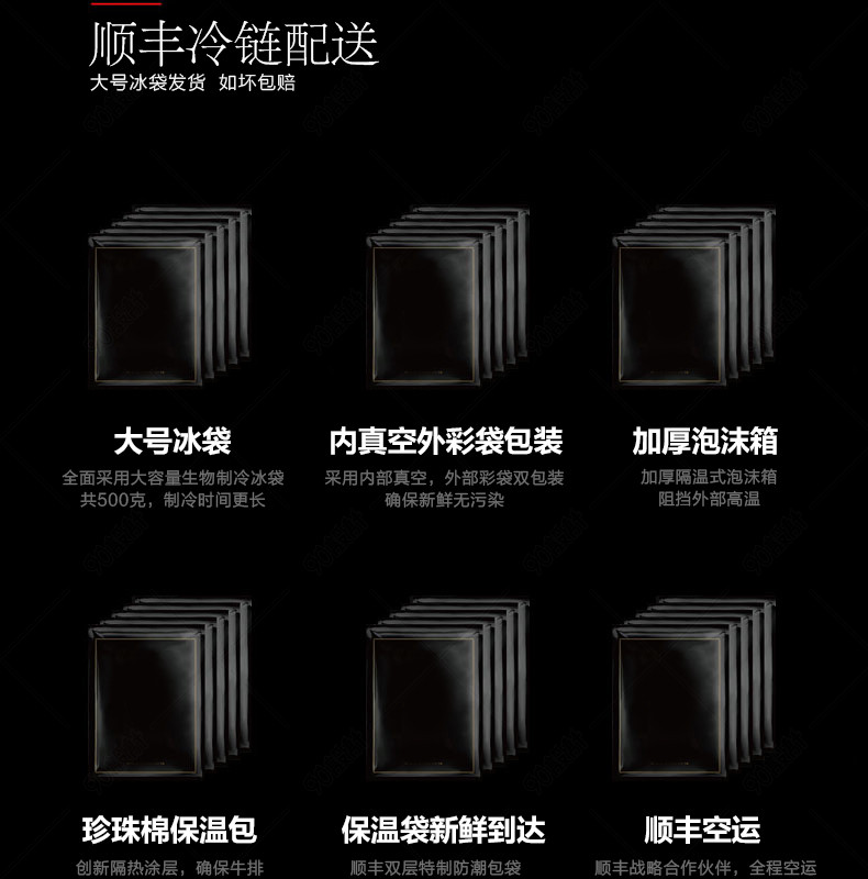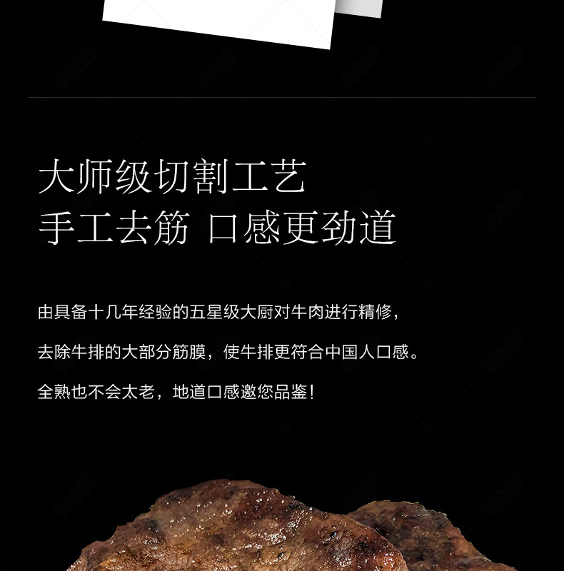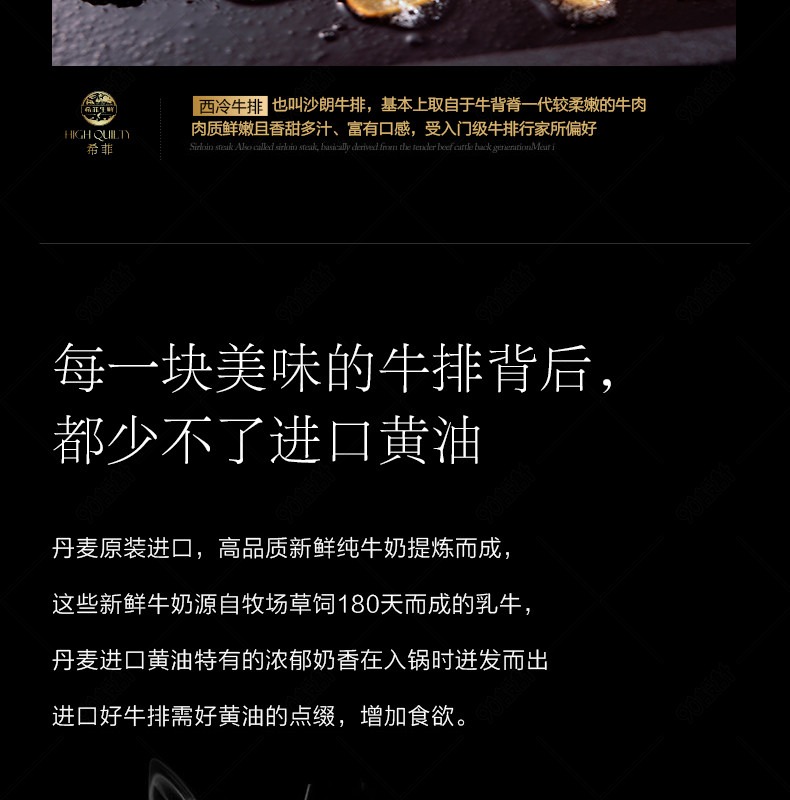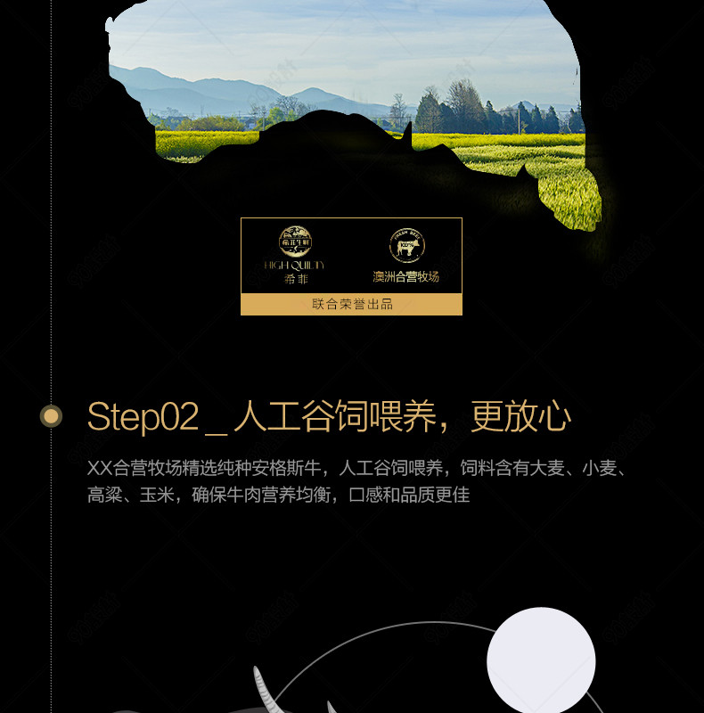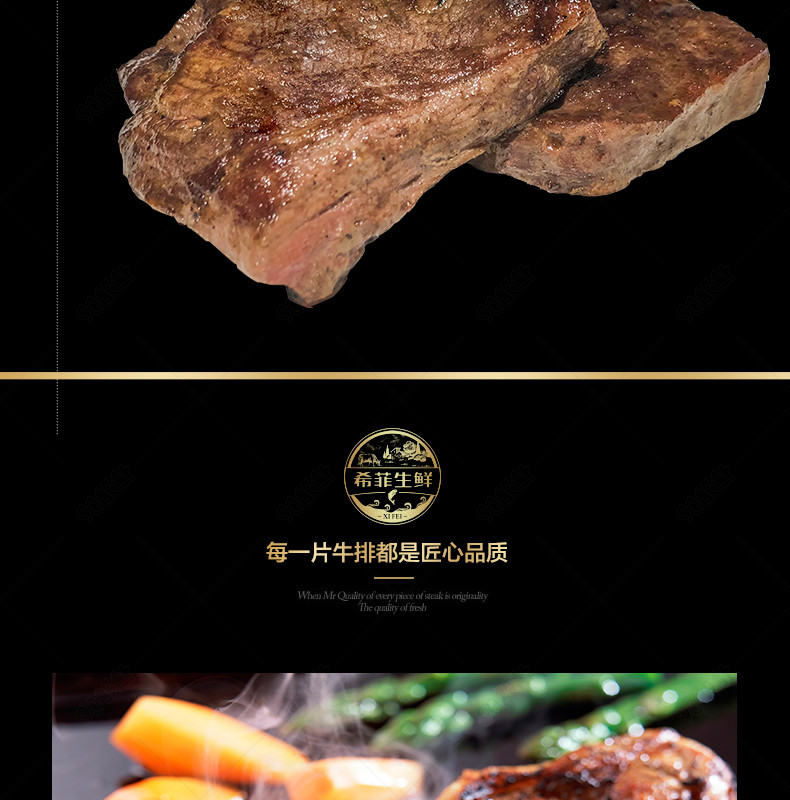 牛排详情页 猪排 牛肉 食品详情页 黑色背景 塑封包装 羽毛 相框 礼盒 餐具 红酒 牛 蔬菜