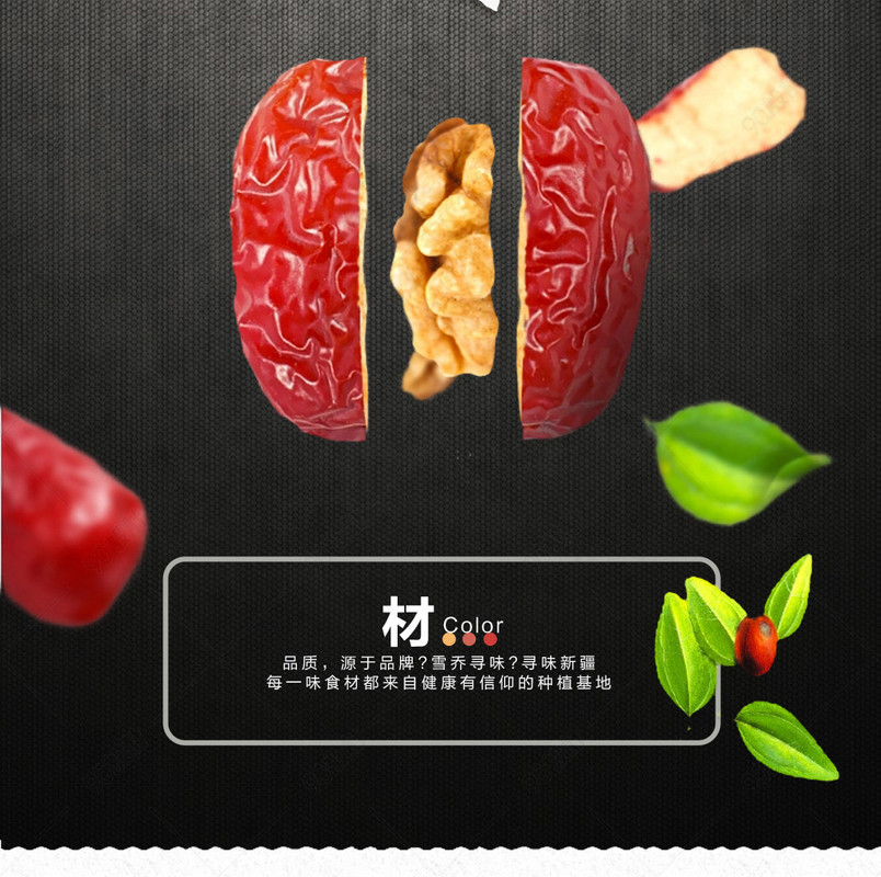 蓝天 云朵 树叶 大枣详情页 干果详情页 枣夹核桃 冬枣 黑色背景 山地 核桃 木板