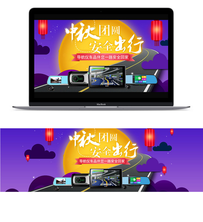 蓝色 中国风 公路 中秋节 灯笼 汽车配件海报 车载电器 脚垫 导航 行车记录仪 全屏海报 模板 PSD