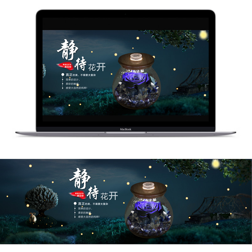 淘宝 唯美 静待花开 蓝色 永生花 夜灯瓶 全屏海报 树叶 光