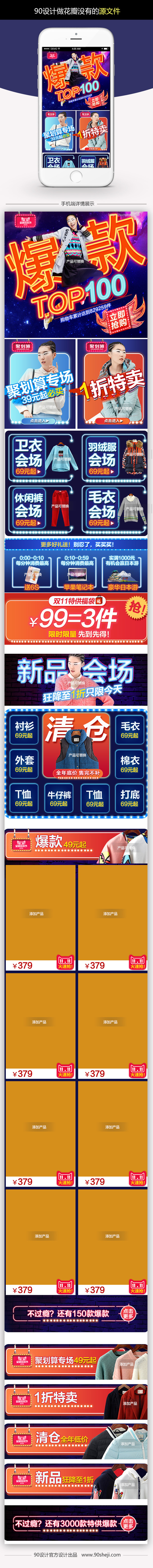 90设计提供炫光风双十一女装无线端首页PSD模板设计素材下载,高清PSD格式。【通用】多类目可用,产品、模特均可替换。【PSD】精细分层,贴好片。【设计】由90设计师独家设计。点击右侧免费下载按钮可进行炫光风双十一女装无线端首页PSD模板淘宝设计素材高速下载。