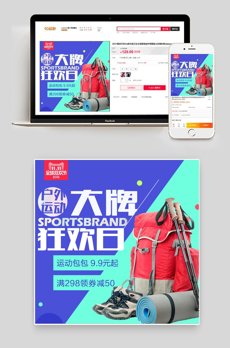 运动包 户外运动 蓝色背景 双十一全球狂欢节 主图 大牌狂欢日 帐篷 简约 大气