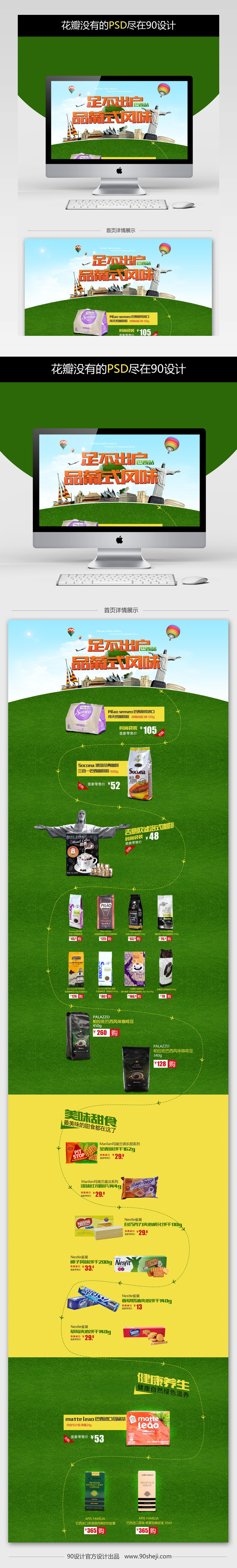 食品零食首页 淘宝天猫首页 专题 足球场 绿色球场背景 巴西 环球世界 咖啡 冲饮 进口原装 葡式风格 蓝天白云 热气球 帆船 路线图 养生