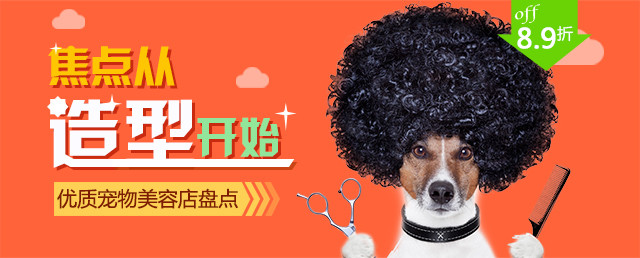 淘宝 天猫 橘色 时尚 宠物 美容 全屏海报 造型 卷发 狗狗 剪刀 梳子