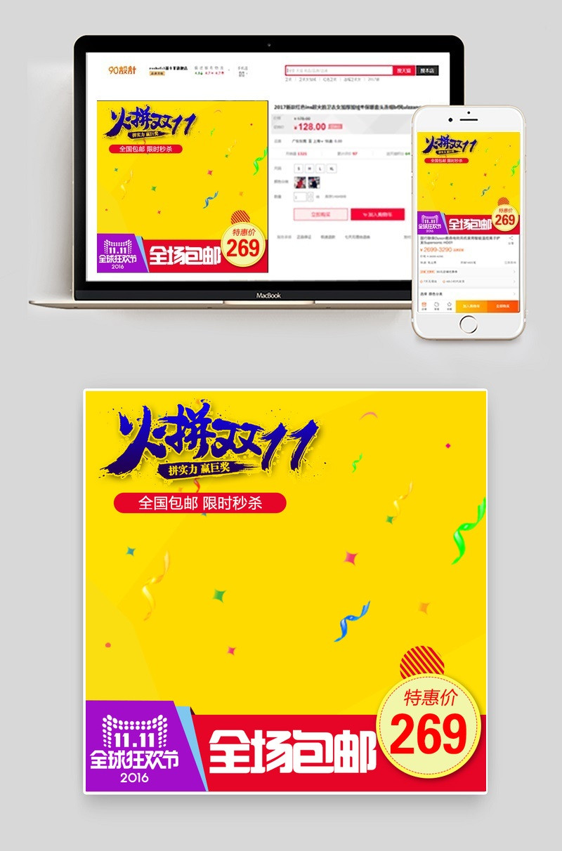 双十一 火拼双十一 全国包邮 限时 秒杀 全球狂欢节 毛笔字 黄色背景 碎片 礼花 全场包邮 通用模板 主图 直通车