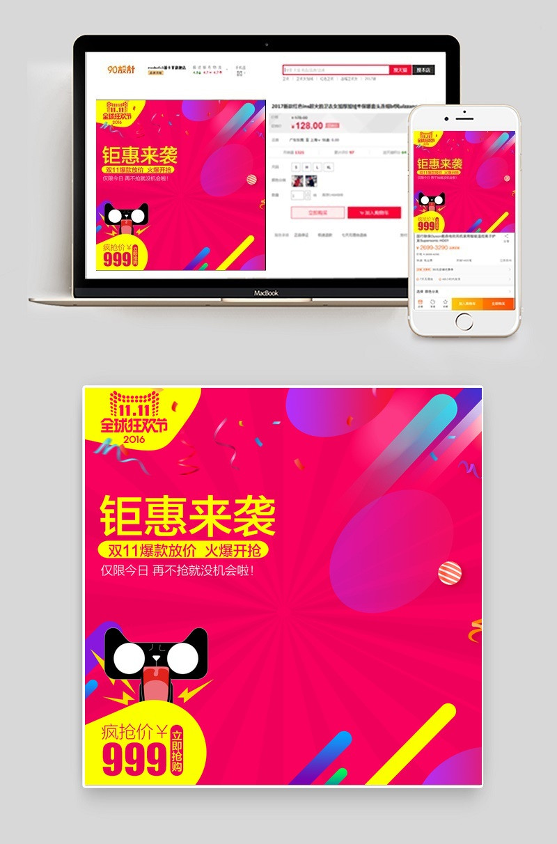 炫彩红色背景 双11 天猫 促销 优惠 立即抢购 999 1111 彩色色块 装饰 简约