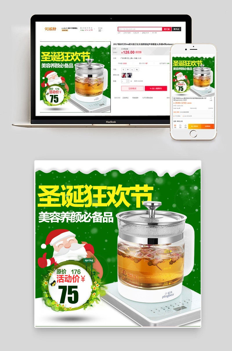 绿色唯美风圣诞节电器养生壶主图PSD模板
