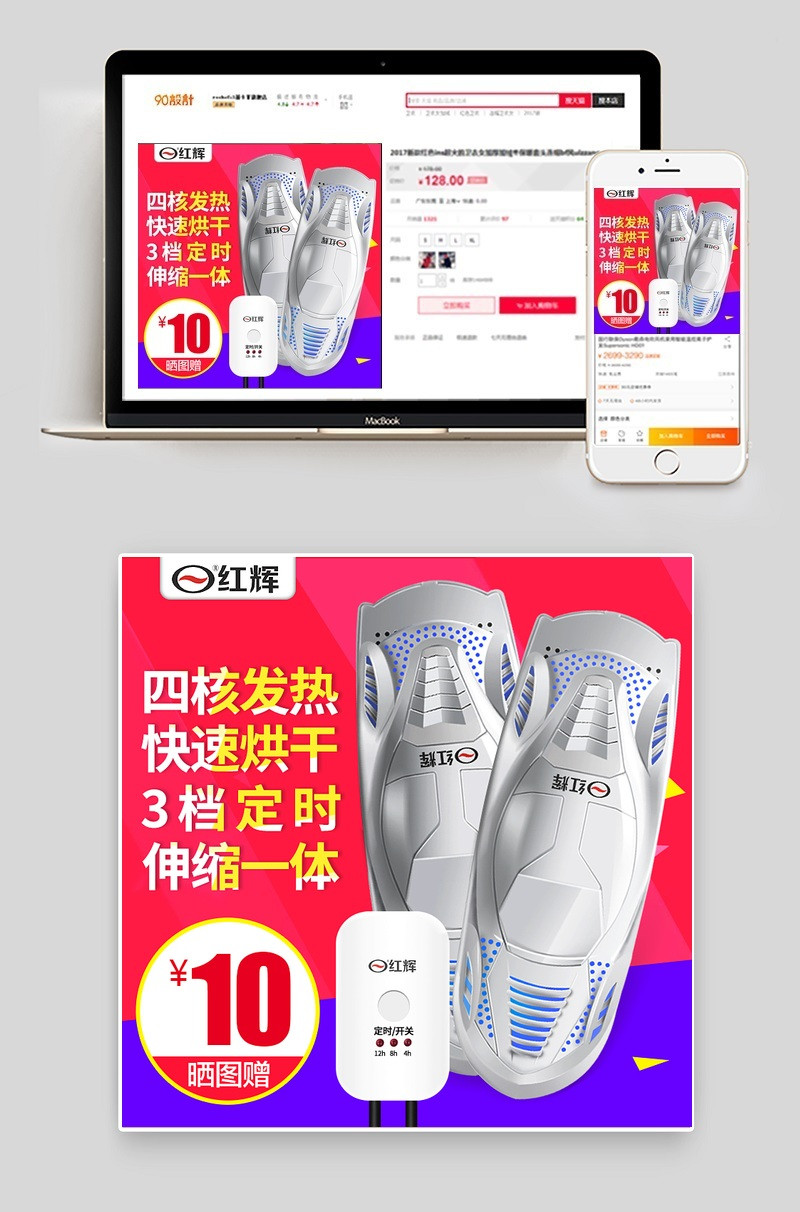 烘鞋器 直通车图 主图 生活电器 红色背景 撞色 促销风格 发热 烘干 定时