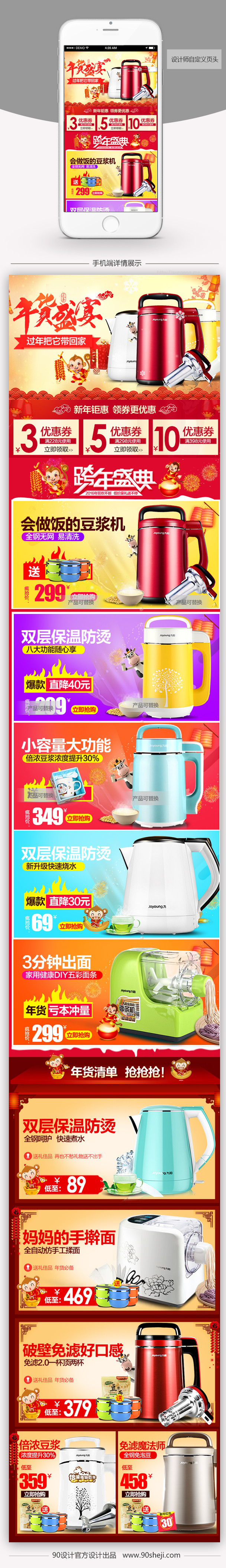 90设计提供红色喜庆电器年货节手机端首页psd设计素材下载,高清PSD格式。【通用】多类目可用,产品、模特均可替换。【PSD】精细分层,贴好片。【设计】由90设计师独家设计。点击右侧免费下载按钮可进行红色喜庆电器年货节手机端首页psd淘宝设计素材高速下载。