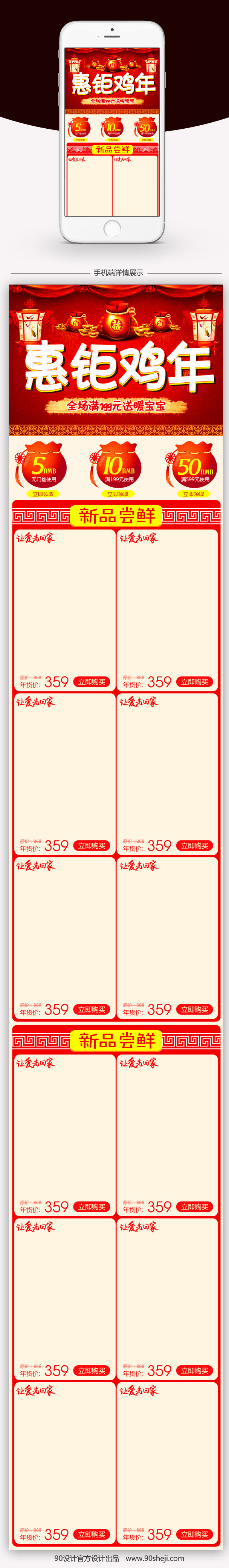 90设计提供红色喜庆手机无线端首页模板PSD设计素材下载,高清PSD格式。【通用】多类目可用,产品、模特均可替换。【PSD】精细分层,贴好片。【设计】由90设计师独家设计。点击右侧免费下载按钮可进行红色喜庆手机无线端首页模板PSD淘宝设计素材高速下载。
