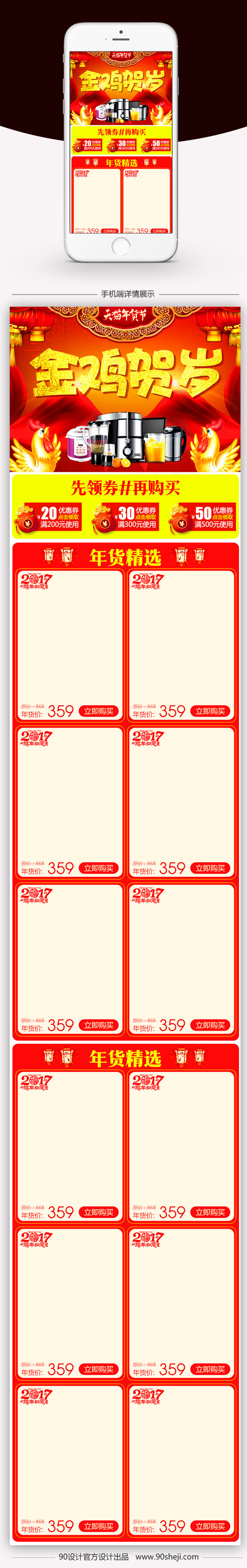 90设计提供2017新年首页年货节首页鸡年手机端首页设计素材下载,高清PSD格式。【通用】多类目可用,产品、模特均可替换。【PSD】精细分层,贴好片。【设计】由90设计师独家设计。点击右侧免费下载按钮可进行2017新年首页年货节首页鸡年手机端首页淘宝设计素材高速下载。