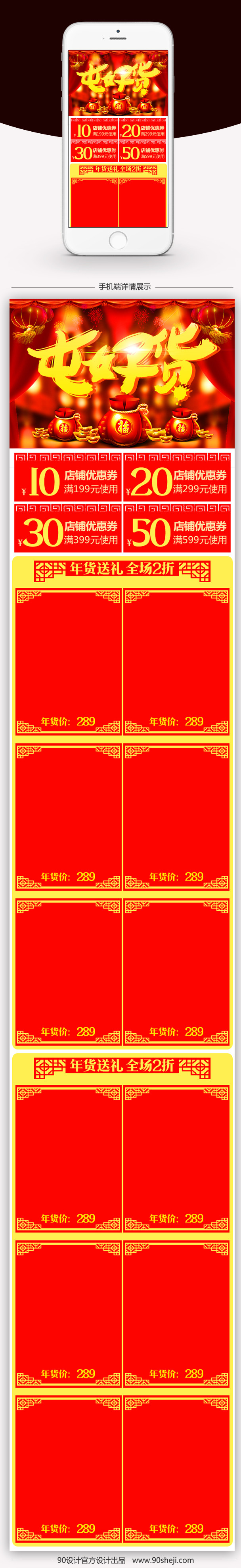 90设计提供红色喜庆手机无线端首页模板PSD设计素材下载,高清PSD格式。【通用】多类目可用,产品、模特均可替换。【PSD】精细分层,贴好片。【设计】由90设计师独家设计。点击右侧免费下载按钮可进行红色喜庆手机无线端首页模板PSD淘宝设计素材高速下载。