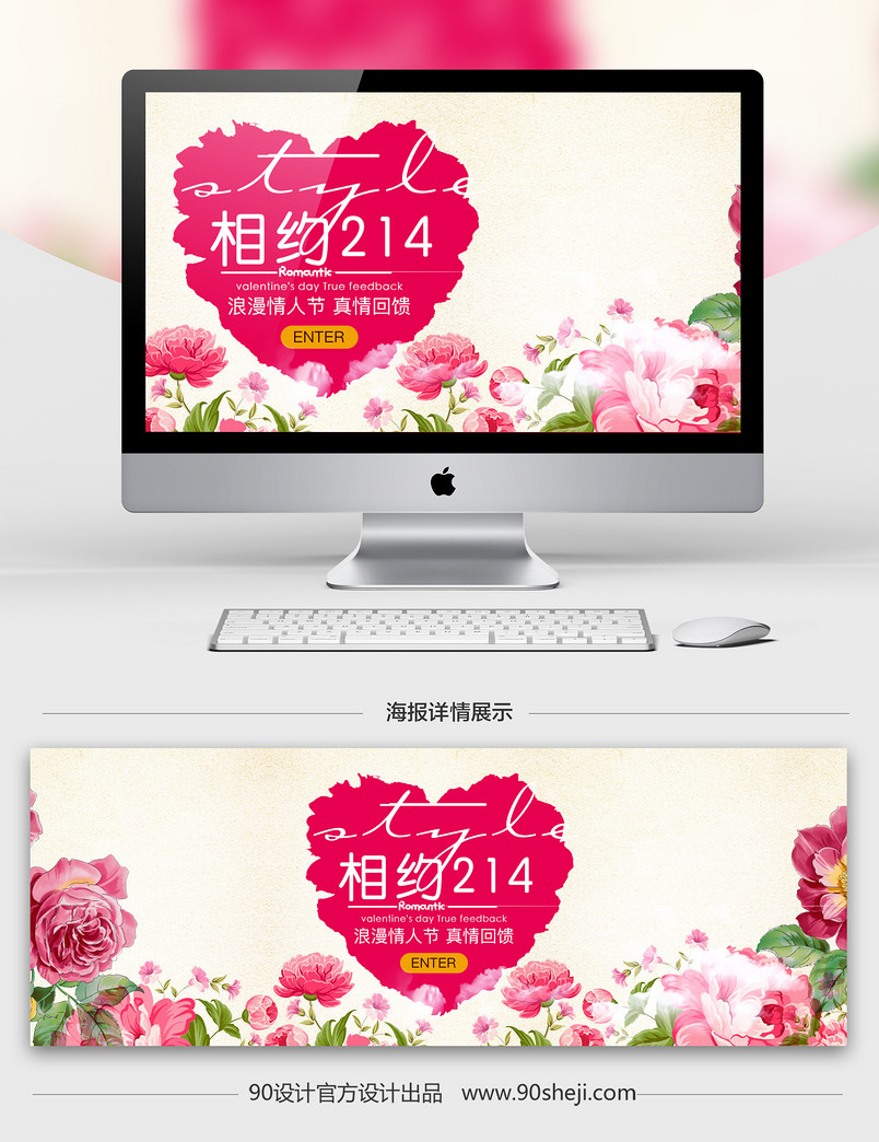 淘宝 天猫 浪漫 情人节 相约214 粉色 玫红色 唯美 爱心 通用海报 花朵
