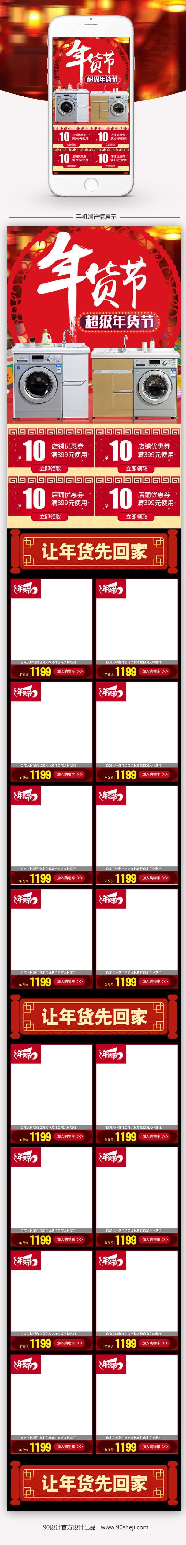 90设计提供喜庆中国红年货节电器手机端首页PSD模板设计素材下载,高清PSD格式。【通用】多类目可用,产品、模特均可替换。【PSD】精细分层,贴好片。【设计】由90设计师独家设计。点击右侧免费下载按钮可进行喜庆中国红年货节电器手机端首页PSD模板淘宝设计素材高速下载。
