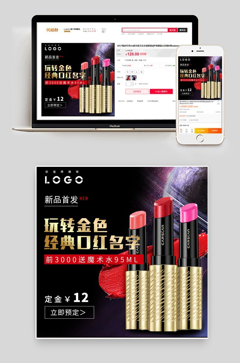口红 口红主图 主图 直通车 psd模板 金色字体 简约 大气 轻奢风 黑色背景 唇彩 唇膏 笔刷效果 k