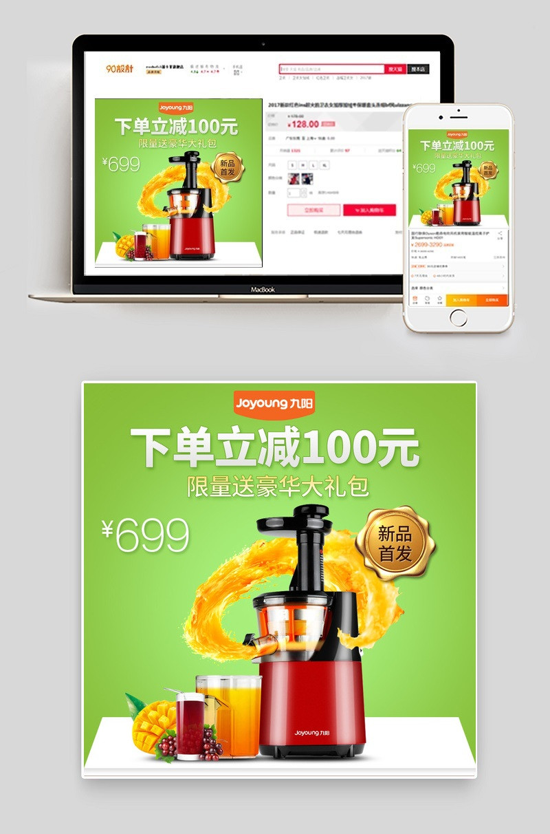 天猫淘宝数码家电榨汁机主图psd模板 榨汁机主图 豆浆机主图 苏你易购主图 九阳主图 豆浆机主图 电饭煲 电磁炉 料理机 淘宝主图 绿色背景主图