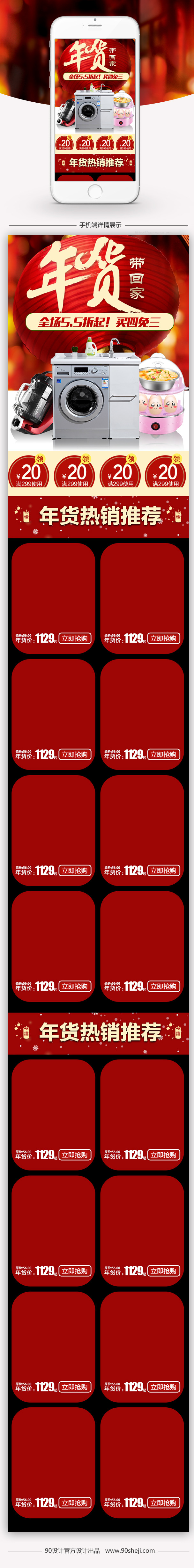 90设计提供红色喜庆年货节电器手机端首页PSD模板设计素材下载,高清PSD格式。【通用】多类目可用,产品、模特均可替换。【PSD】精细分层,贴好片。【设计】由90设计师独家设计。点击右侧免费下载按钮可进行红色喜庆年货节电器手机端首页PSD模板淘宝设计素材高速下载。