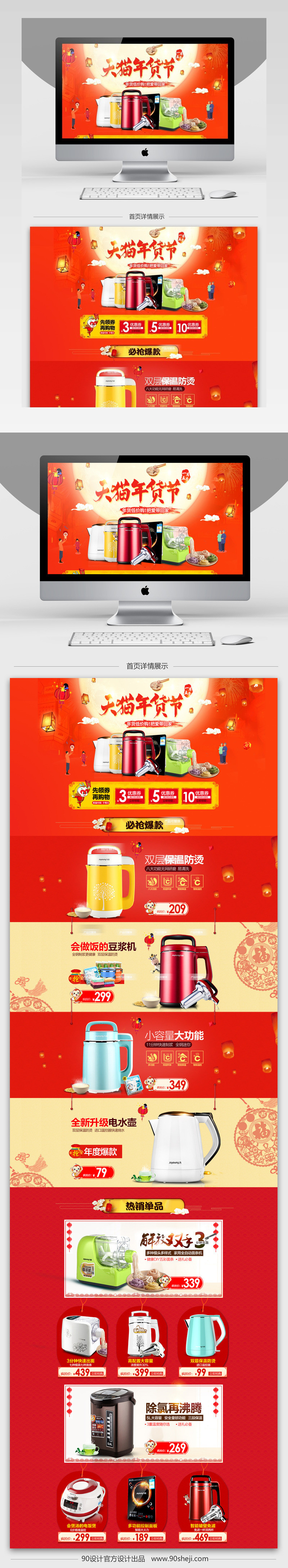 90设计提供红色大气年货节首页模板设计素材下载,高清PSD格式。【通用】多类目可用,产品、模特均可替换。【PSD】精细分层,贴好片。【设计】由90设计师独家设计。点击右侧免费下载按钮可进行红色大气年货节首页模板淘宝设计素材高速下载。