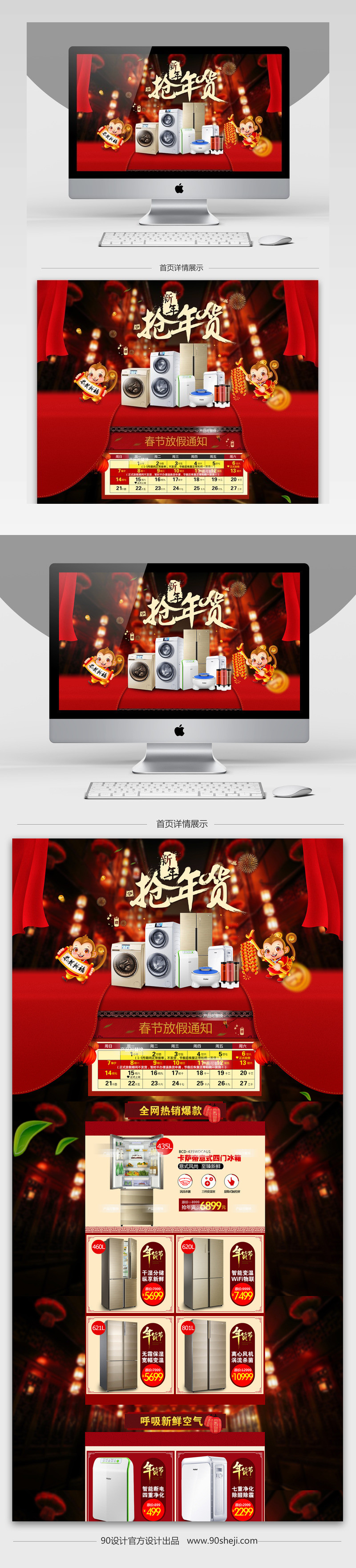 淘宝首页 年货节 家电 简约 喜庆 中国风 中国年 四门冰箱 双开门 净化器 白色 生活电器 psd模板 &稀饭丸子