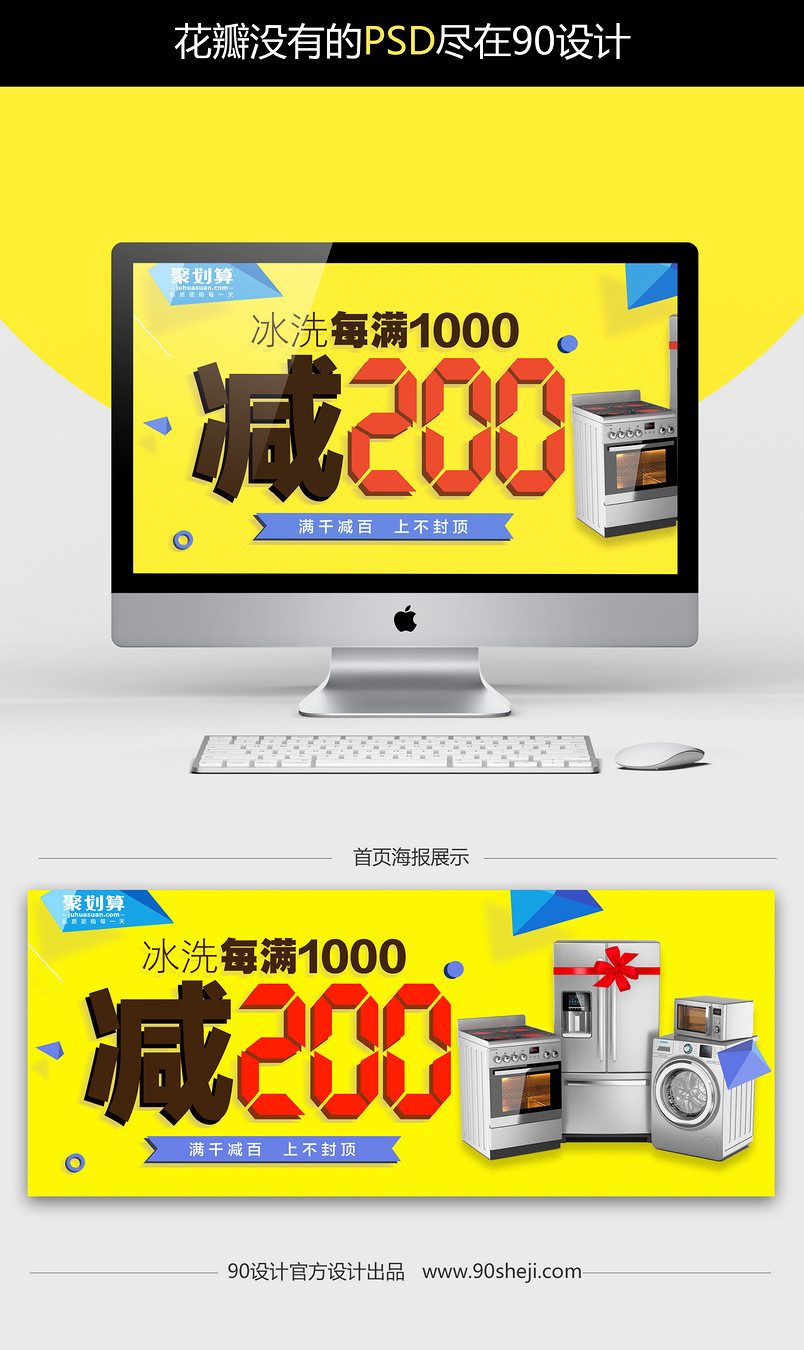 生活电器 家电 全屏海报 冰箱 微波炉 洗衣机 黄色背景 简约 扁平化 聚划算 几何图形 漂浮效果