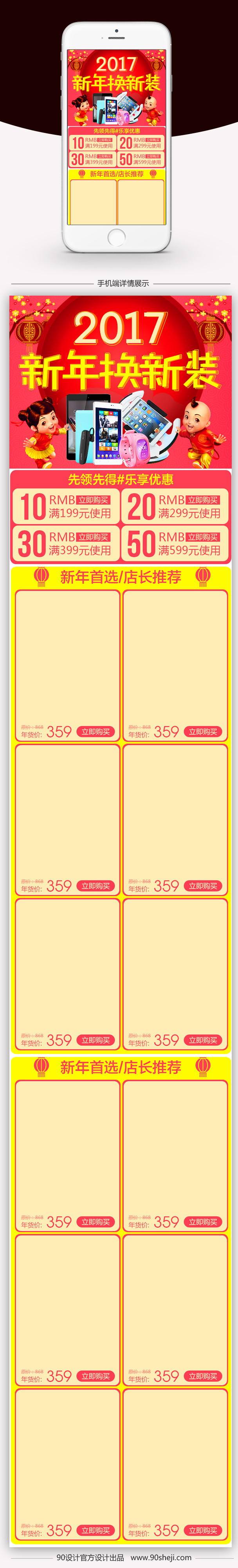 90设计提供2017新年首页年货节首页鸡年手机端首页设计素材下载,高清PSD格式。【通用】多类目可用,产品、模特均可替换。【PSD】精细分层,贴好片。【设计】由90设计师独家设计。点击右侧免费下载按钮可进行2017新年首页年货节首页鸡年手机端首页淘宝设计素材高速下载。