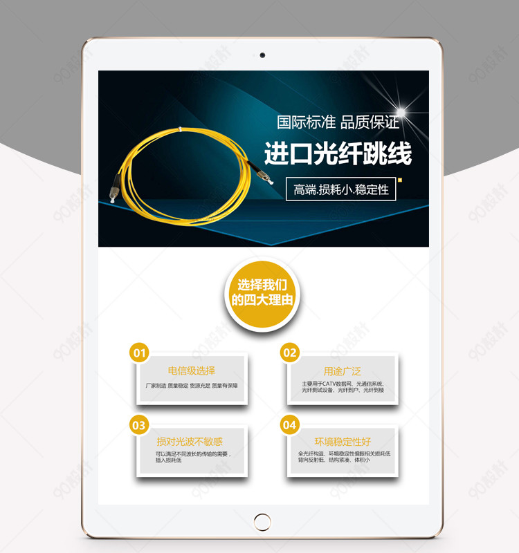 90设计提供淘宝天猫高质进口光纤跳线 详情页psd模板设计素材下载,高清PSD格式。【通用】多类目可用,产品、模特均可替换。【PSD】精细分层,贴好片。【设计】由90设计师独家设计。点击右侧免费下载按钮可进行淘宝天猫高质进口光纤跳线 详情页psd模板淘宝设计素材高速下载。
