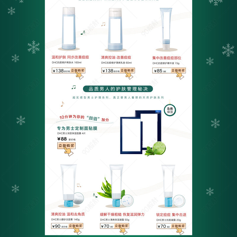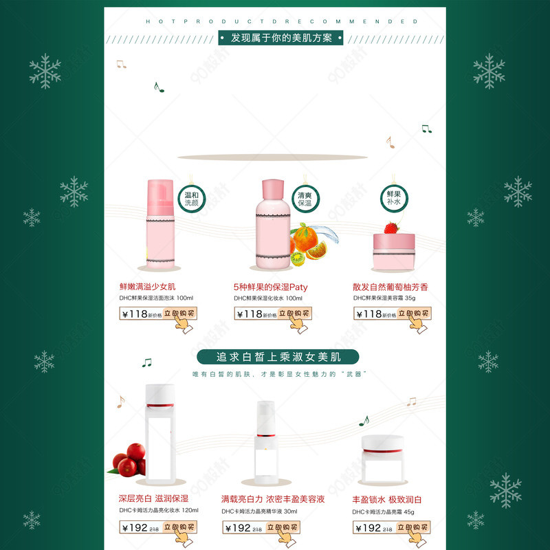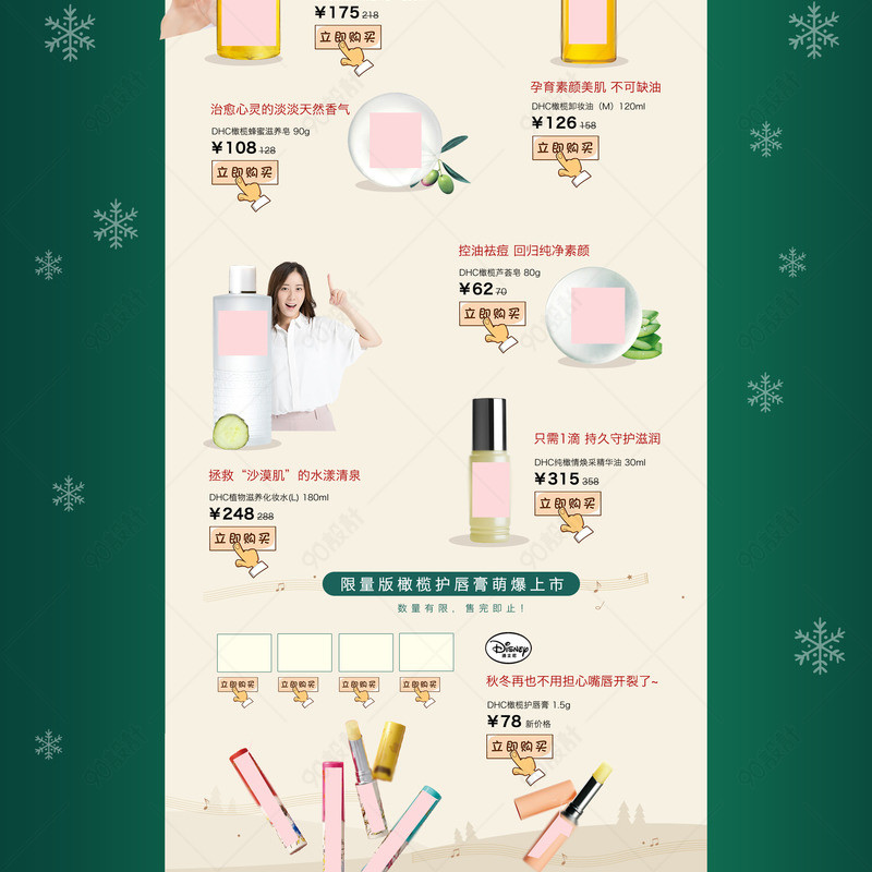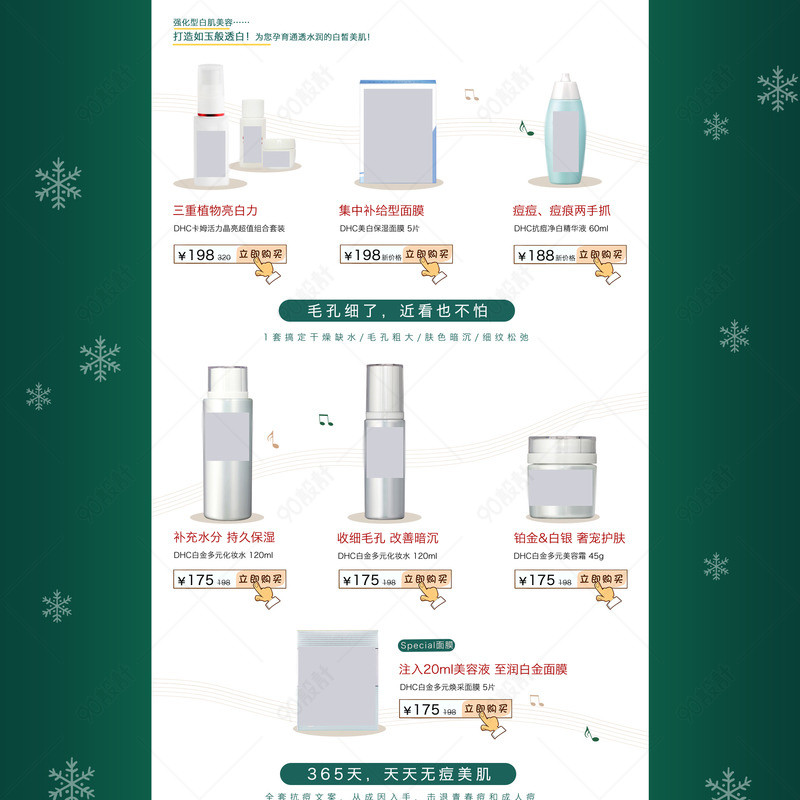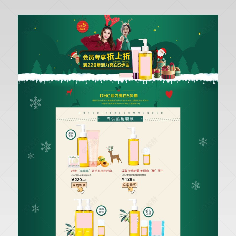 淘宝 天猫 首页PSD装修模板 化妆品 圣诞节 护肤品 绿色背景 雪花 冬季 王从美