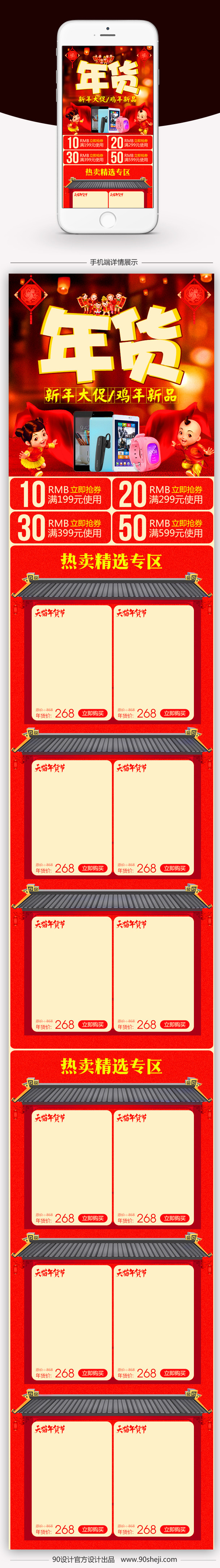 90设计提供红色中国风手机无线端首页模板PSD设计素材下载,高清PSD格式。【通用】多类目可用,产品、模特均可替换。【PSD】精细分层,贴好片。【设计】由90设计师独家设计。点击右侧免费下载按钮可进行红色中国风手机无线端首页模板PSD淘宝设计素材高速下载。