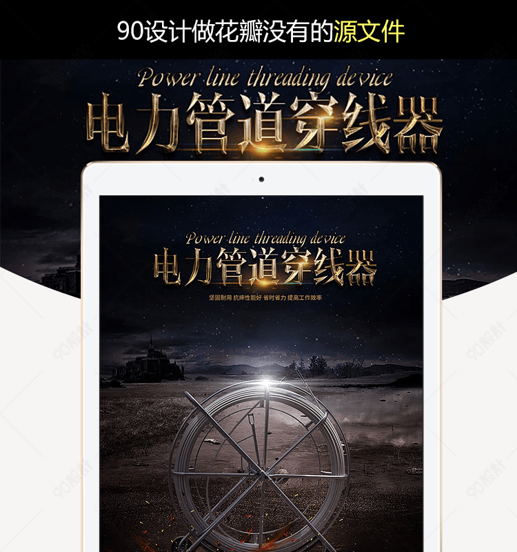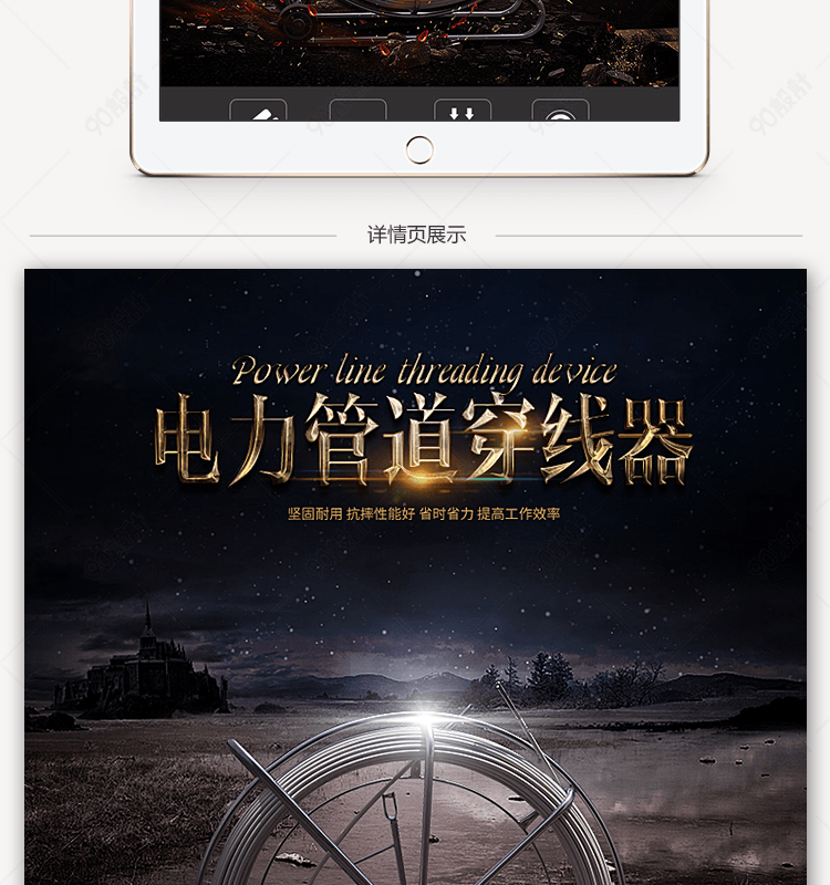 90设计提供高端风调电力穿线器详情页PSD模板设计素材下载,高清PSD格式。【通用】多类目可用,产品、模特均可替换。【PSD】精细分层,贴好片。【设计】由90设计师独家设计。点击右侧免费下载按钮可进行高端风调电力穿线器详情页PSD模板淘宝设计素材高速下载。