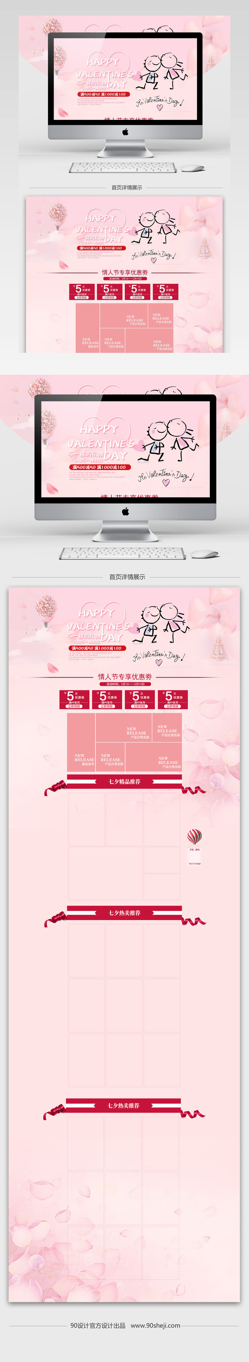 情人节 简约 时尚 清新 通用店铺首页 粉色背景 优惠券 花瓣 不一样的礼物 热气球 玫瑰花 浪漫 粉色 小人 少女心 情人节专属