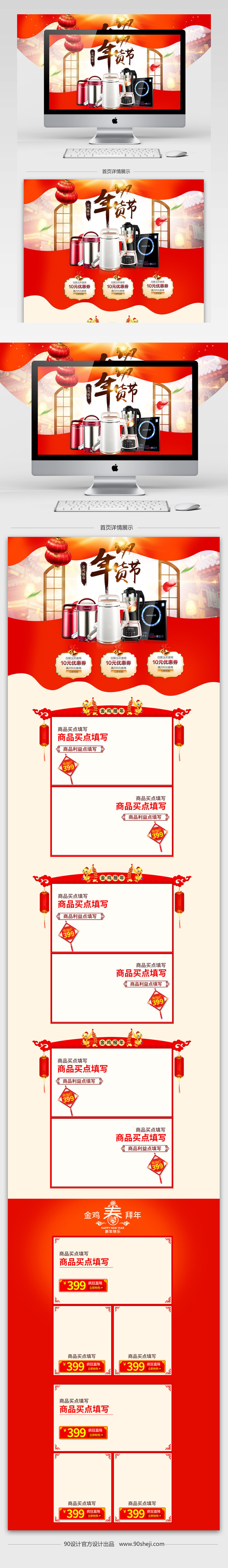 90设计提供红色中国风年货节家电首页模板设计素材下载,高清PSD格式。【通用】多类目可用,产品、模特均可替换。【PSD】精细分层,贴好片。【设计】由90设计师独家设计。点击右侧免费下载按钮可进行红色中国风年货节家电首页模板淘宝设计素材高速下载。