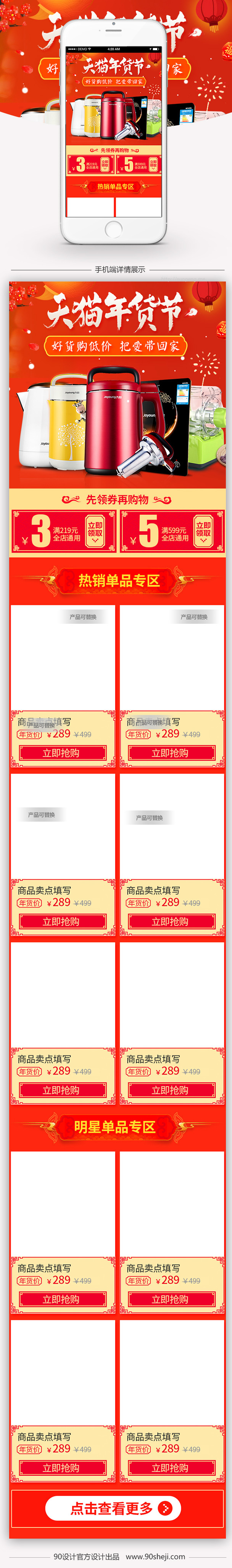 90设计提供红色中国风年货节生活电器手机端页面psd设计素材下载,高清PSD格式。【通用】多类目可用,产品、模特均可替换。【PSD】精细分层,贴好片。【设计】由90设计师独家设计。点击右侧免费下载按钮可进行红色中国风年货节生活电器手机端页面psd淘宝设计素材高速下载。