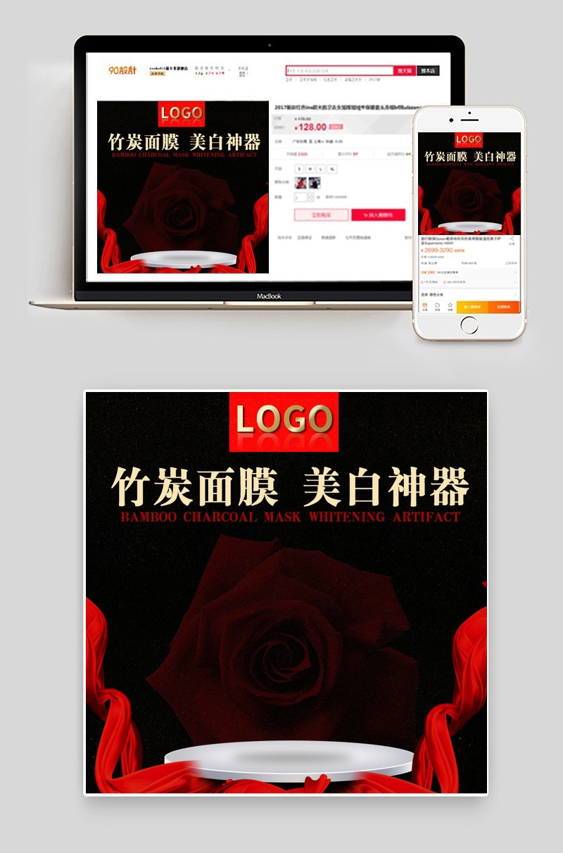 天猫 淘宝 面膜 黑色 彩带 玫瑰花 时尚 面膜主图PSD 字体样式 喷砂金色 精华 化妆水 爽肤水 面膜 纯露 防晒乳 护手霜 洁面膏