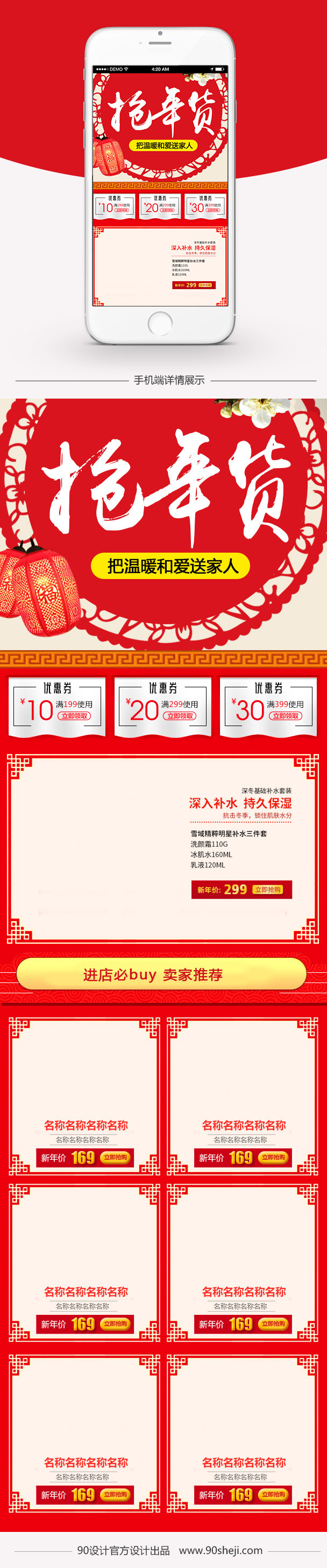90设计提供红色喜庆年货节女装无线端首页模板PSD设计素材下载,高清PSD格式。【通用】多类目可用,产品、模特均可替换。【PSD】精细分层,贴好片。【设计】由90设计师独家设计。点击右侧免费下载按钮可进行红色喜庆年货节女装无线端首页模板PSD淘宝设计素材高速下载。